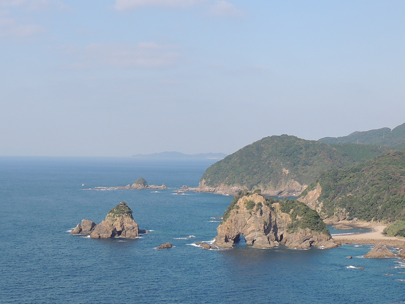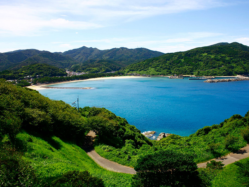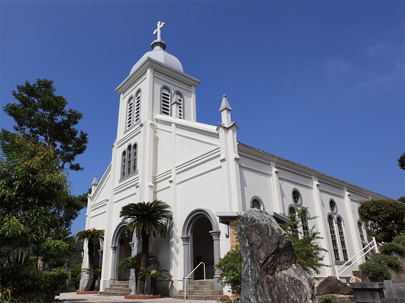 下田温泉から南下すると天草灘に映える夕陽が美しい海岸線が続きます。天草随一の名所「妙見浦」や「鬼海ヶ浦展望所」「十三仏公園」など、「五足の靴」の足跡、キリシタンの歴史に触れる「大江天主堂」「崎津天主堂」なども点在しています。